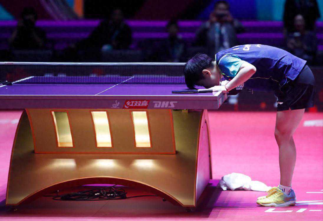 赛后出现了感人的一幕,孙颖莎直接躺在地上,另外一边的王曼昱则是黯然失色,直接跪在地上心无可恋,孙颖莎起来后深吻了球台,然后起身竖起大拇指指向观众席。
