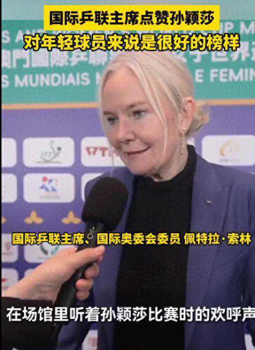 国际乒联主席佩特拉·索林表示,在场馆里听着孙颖莎比赛时的欢呼声是非常令人激动的。看见观众在比赛中支持她,以及她在赛场回馈球迷的表现,这些都对年轻球员来说是很好的榜样。